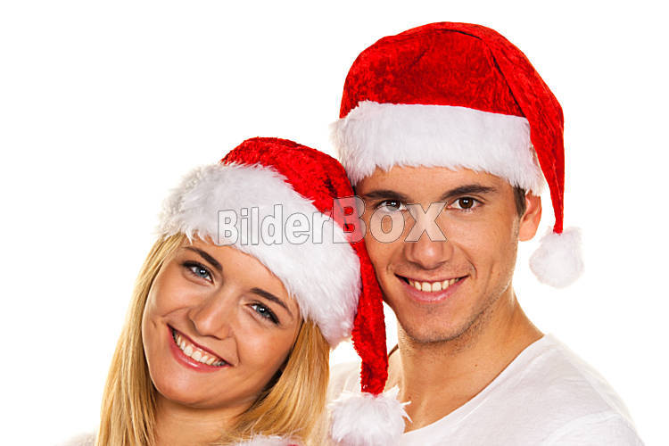 Beschreibung Junges Paar zu Weihnachten mit Mützen des Weihnachtsmannes