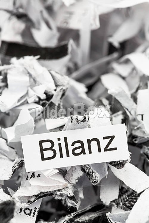 Beschreibung Papierschnitzel mit Stichwort Bilanz, Symbolfoto für Datenvernichtung, Bilanzierung, und ökonomische Analyse