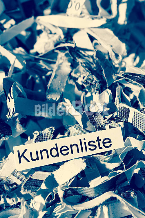 Beschreibung Papierschnitzel mit dem Stichwort Kundenliste, Symbolfoto für Kundendaten und Datenschutz
