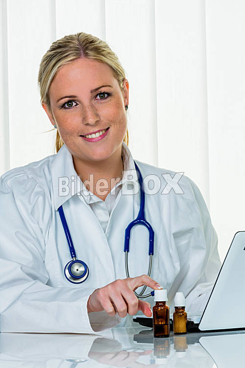 Beschreibung Portrait einer jungen, sympathischen Ärztin in ihrer Arztpraxis. Lächeln schenkt Vertrauen.