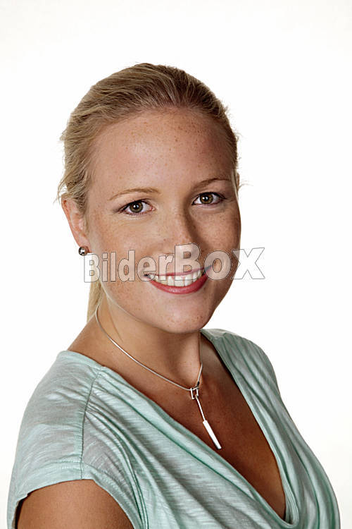 Beschreibung Das Portrait einer jungen Frau. Isoliert vor weißem Hintergrund