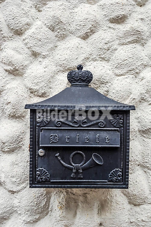Beschreibung Ein Postkasten an einer Huasmauer wartet auf ankommende Briefe
