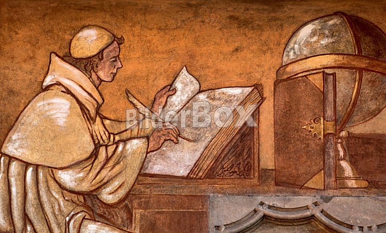 Beschreibung Prag, Tschechien. Malerei eines Mönches auf einer Hausfassade