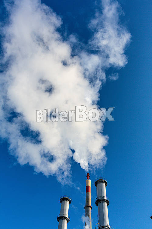 Beschreibung Schlot eines Industriebetriebes mit starkem Rauch. Symbolfoto für Umweltschutz und Ozon.