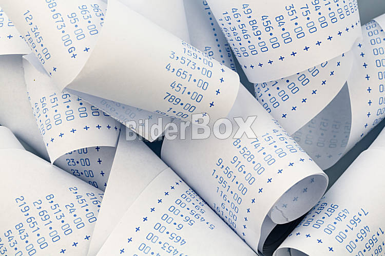 Beschreibung Die Streifen eines Taschenrechners. Symbolfoto für Kosten, Planung, Kalkulation, Gewinn und Umsatz