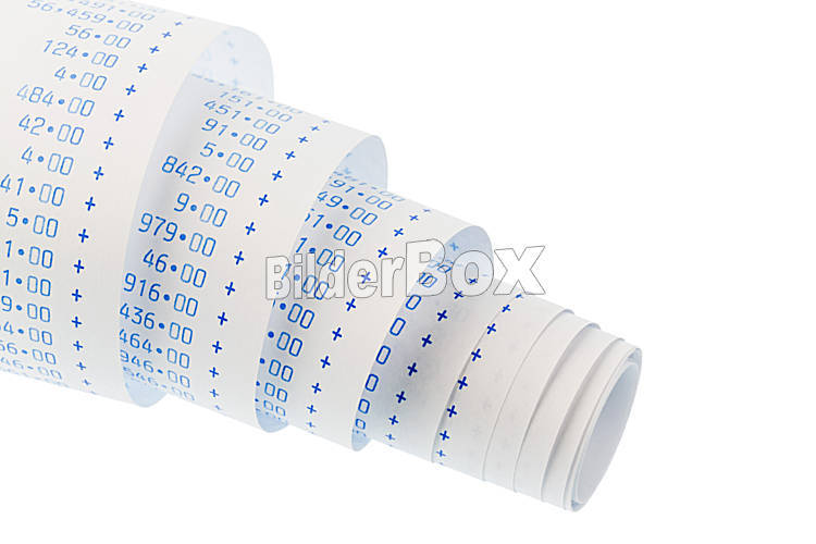 Beschreibung Der Rechenstreifen eines Taschenrechners auf weißem Hintergrund. Symbolfoto für Controlling, Buchhaltung, Steuern und Finanzen