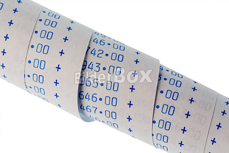 Beschreibung Der Rechenstreifen eines Taschenrechners auf weißem Hintergrund. Symbolfoto für Controlling, Buchhaltung, Steuern und Finanzen