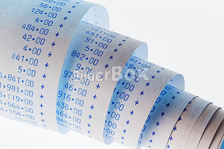Beschreibung Der Rechenstreifen eines Taschenrechners auf weißem Hintergrund. Symbolfoto für Controlling, Buchhaltung, Steuern und Finanzen