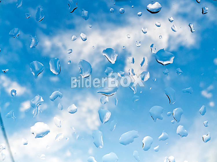 Beschreibung Viele Regentropfen bei Schlechtwetter auf einer Fensterscheibe. Wetter Besserung. Blauer Himmel durch Fensterscheibe.