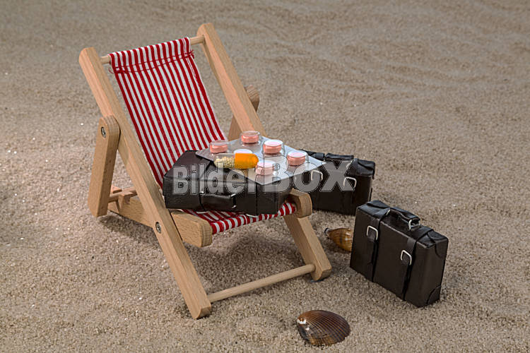 Beschreibung Symbolfoto Reiseapotheke Impfungen für Fernreisen. Tabletten auf einem Liegestuhl.