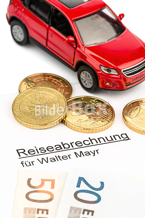 Beschreibung Eine Abrechnung von Reisekosten mit Auto und Euromünzen