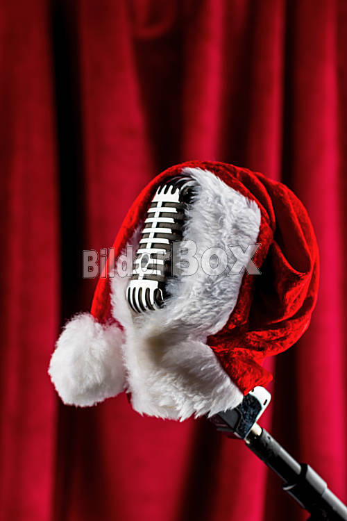 Beschreibung Ein altes Retromikrofon mit Weihnachtsmütze vor rotem Samt Hintergrund.
