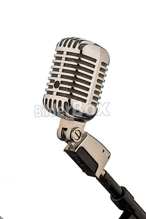 Beschreibung Ein altes Retromikrofon vor weißem Hintergrund.