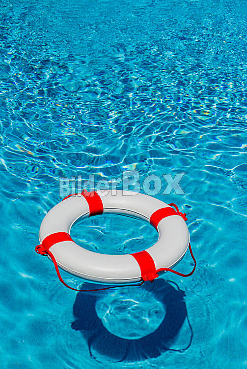 Beschreibung Ein Rettungsreifen schwimmt in einem Pool. Symbolfoto für Rettung und Krisenbewältigung bei Finanzkrise und Bankenkrise.