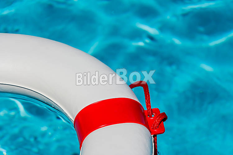 Beschreibung Ein Rettungsreifen schwimmt in einem Pool. Symbolfoto für Rettung und Krisenbewältigung bei Finanzkrise und Bankenkrise.