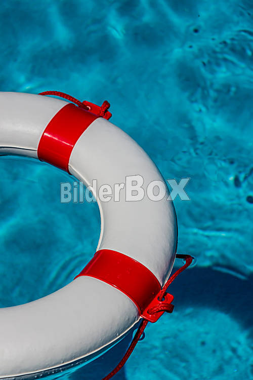 Beschreibung Ein Rettungsreifen schwimmt in einem Pool. Symbolfoto für Rettung und Krisenbewältigung bei Finanzkrise und Bankenkrise.