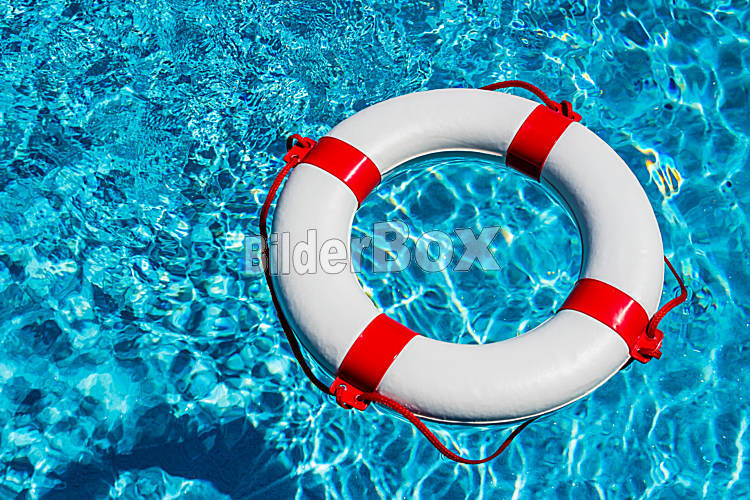 Beschreibung Ein Rettungsreifen schwimmt in einem Pool. Symbolfoto für Rettung und Krisenbewältigung bei Finanzkrise und Bankenkrise.