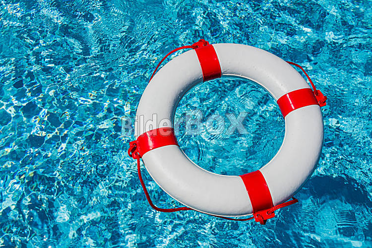 Beschreibung Ein Rettungsreifen schwimmt in einem Pool. Symbolfoto für Rettung und Krisenbewältigung bei Finanzkrise und Bankenkrise.