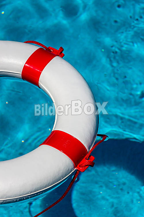 Beschreibung Ein Rettungsreifen schwimmt in einem Pool. Symbolfoto für Rettung und Krisenbewältigung bei Finanzkrise und Bankenkrise.