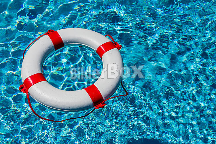 Beschreibung Ein Rettungsreifen schwimmt in einem Pool. Symbolfoto für Rettung und Krisenbewältigung bei Finanzkrise und Bankenkrise.