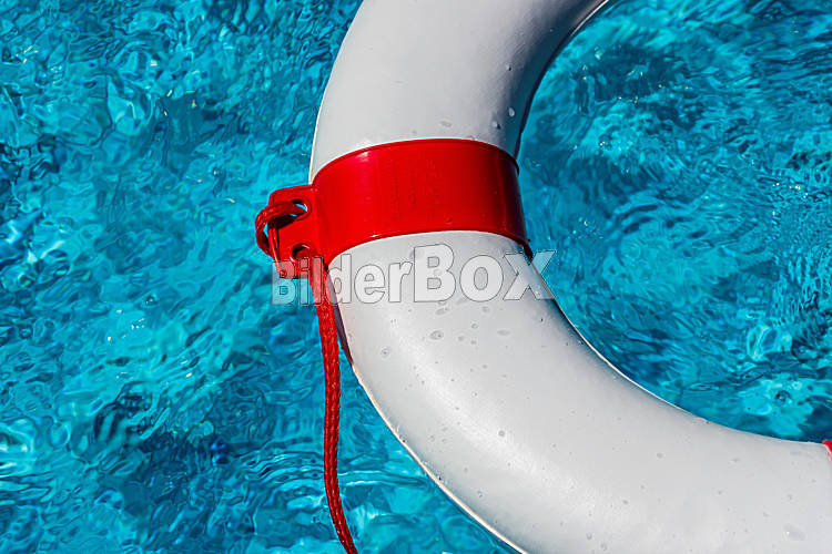 Beschreibung Ein Rettungsreifen schwimmt in einem Pool. Symbolfoto für Rettung und Krisenbewältigung bei Finanzkrise und Bankenkrise.