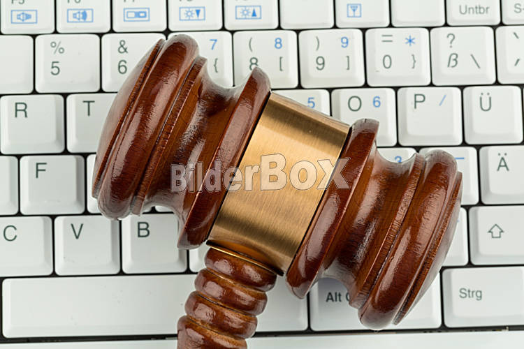 Beschreibung Richterhammer auf Computertastatur, Symbolfoto für E-Commerce und Verbraucherschutz