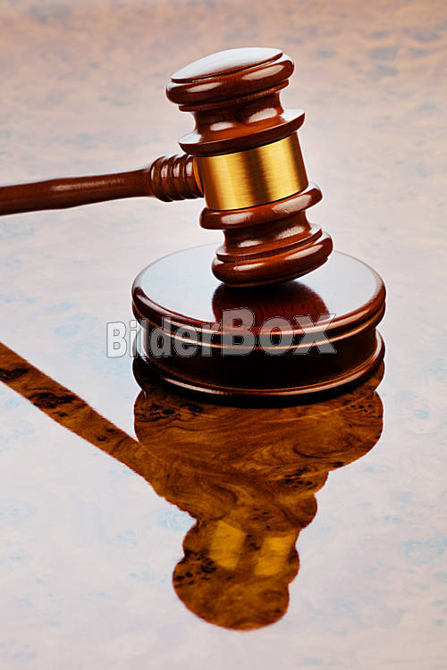 Beschreibung Der Richterhammer eines Richters bei Gericht. Liegt auf einem Schreibtisch.
