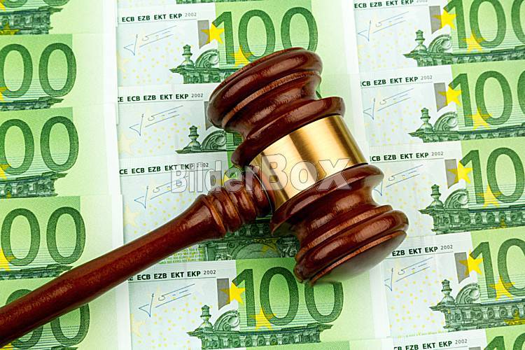 Beschreibung Richterhammer und Euro-Geldscheine. Symbolfoto für Kosten bei Gericht, Rechtsstaat und Auktionen