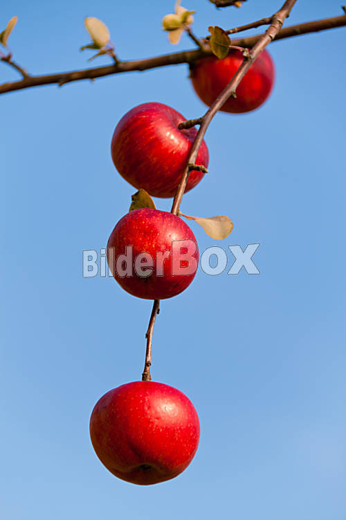 Beschreibung Viele rote Äpfel auf Baum im Herbst. Zweig eines Apfelbaumes