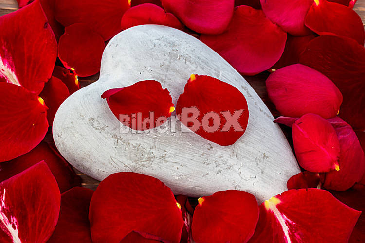 Beschreibung Auf einem Stein in Herz Form liegen rote Rosenblätter. Rosen als Symbol für Liebe, Romantik, Valentinstag