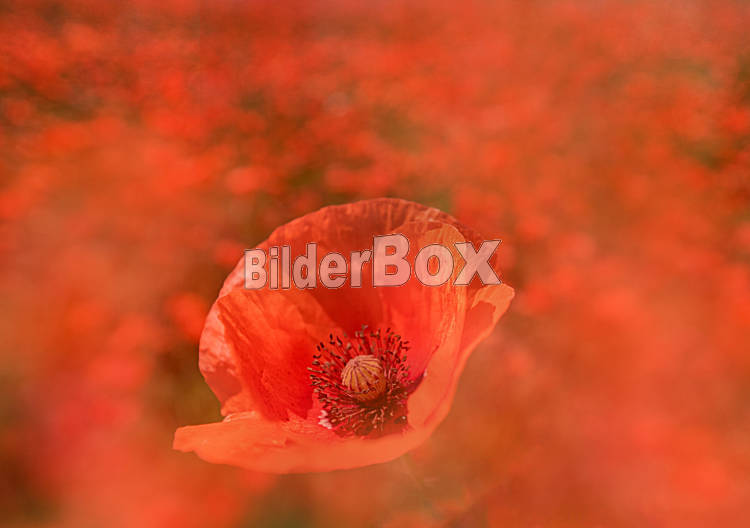 Beschreibung Eine rote Mohnblüte auf einem Mohnblumen Feld