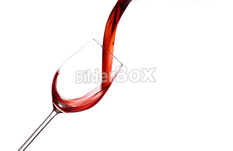 Beschreibung In ein Glas wird schwungvoll roter Wein eingeleert. Rotwein im Rotweinglas