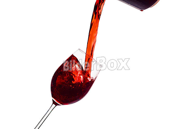 Beschreibung In ein Glas wird schwungvoll roter Wein eingeleert. Rotwein im Rotweinglas