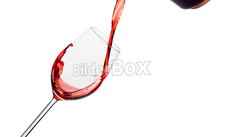 Beschreibung In ein Glas wird schwungvoll roter Wein eingeleert. Rotwein im Rotweinglas