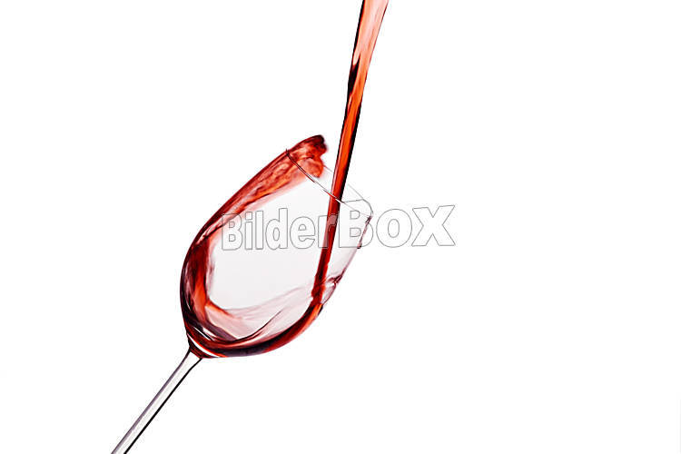 Beschreibung In ein Glas wird schwungvoll roter Wein eingeleert. Rotwein im Rotweinglas
