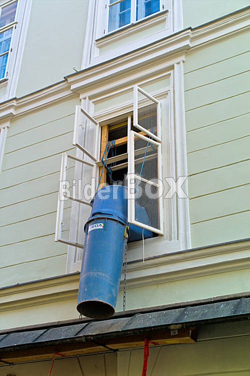 Beschreibung Rutsche für Bauschutt an Wohnhaus, Symbolfoto für Umbau, Sanierung, Wohnraum