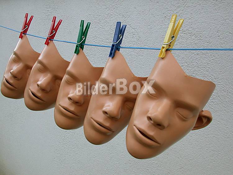 Beschreibung Masken auf einer Waescheleine - Symbol Klonen [ (c) www.BilderBox.com, Erwin Wodicka; A-4062 Breitbrunn, Tel: +43 676 5103 678; Verwendung nur gegen HONORAR, BELEG, URHEBERVERMERK und den AGBs auf...