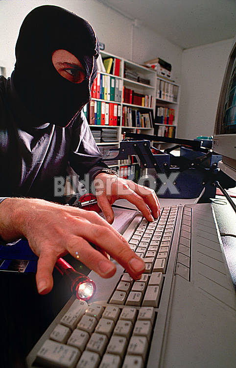 Mann mit Maske sitzt vor einem Computer-Computerkrimineller