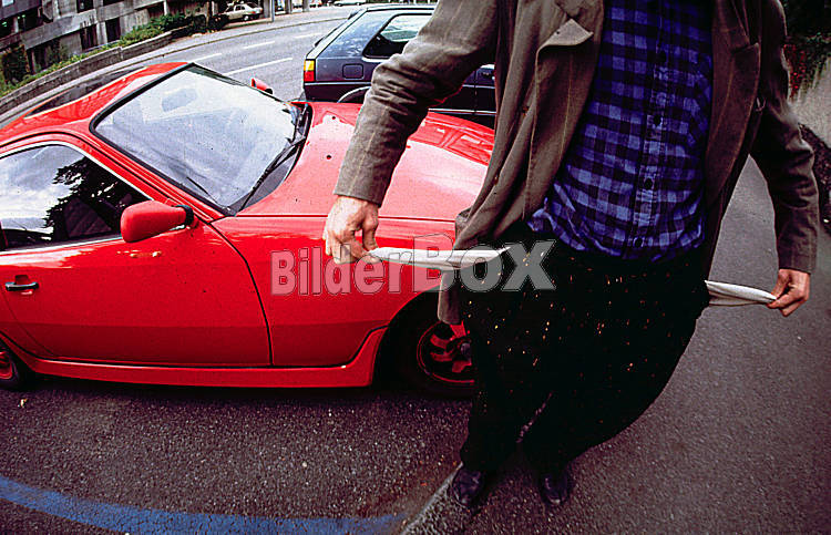 Mann mit leeren Taschen vor einem Auto