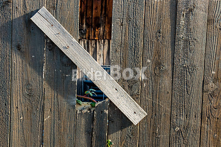 Beschreibung Schößling und alter Bretterzaun, Symbol für Leben, Wachstum, Neubeginn, Kraft, Hoffnung