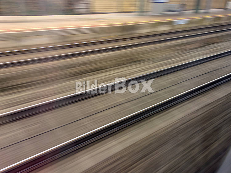 Beschreibung Gleise und Schienen in Bewegung aus einem fahrenden Zug heraus. Symbolfoto für Zugfahrt, Tempo und Dynamik.