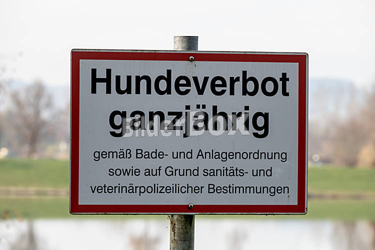 Beschreibung Schild Hundeverbot ganzjährig, Symbol für Hygiene, Verbote, Badeverbot