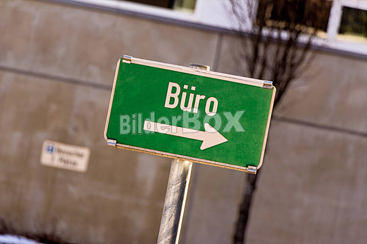 Beschreibung Ein Schild mit einem Pfeil zeigt an wo das Büro zu finden ist