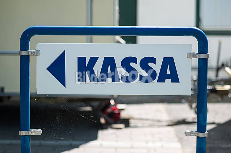 Beschreibung Ein Hinweisschild, wo die Kassa bei einem Eingang zu finden ist.