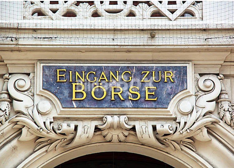 Beschreibung Schild, Eingang zur Börse, Symbolfoto für Finanzmarkt und Aktienspekulation