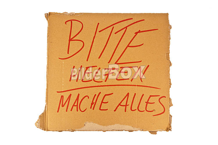 Beschreibung Das Schild aus Karton eines Obdachlosen. Isoliert auf weißem Hintergrund