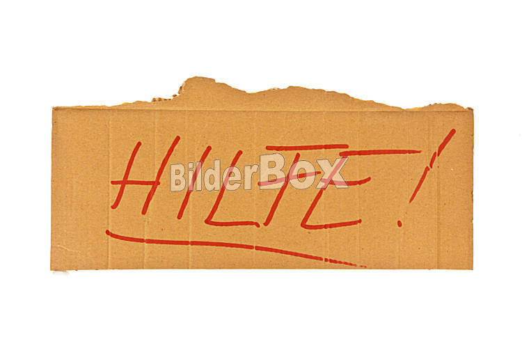 Beschreibung Das Schild aus Karton eines Obdachlosen. Isoliert auf weißem Hintergrund