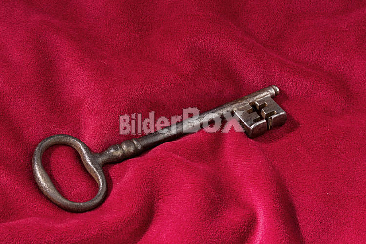 Beschreibung Ein Schlüssel liegt auf einem roten Samtkissen. Symbolfoto für Schlüsselübergabe bei Unternehmen.