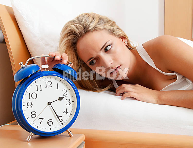 Beschreibung Schlaflosigkeit mit Uhr in der Nacht. Frau kann nicht schlafen.