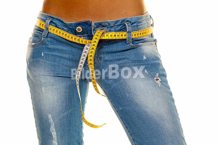 Beschreibung Eine junge, schlanke Frau in Jeans mit Massband nach erfolgreicher Diät